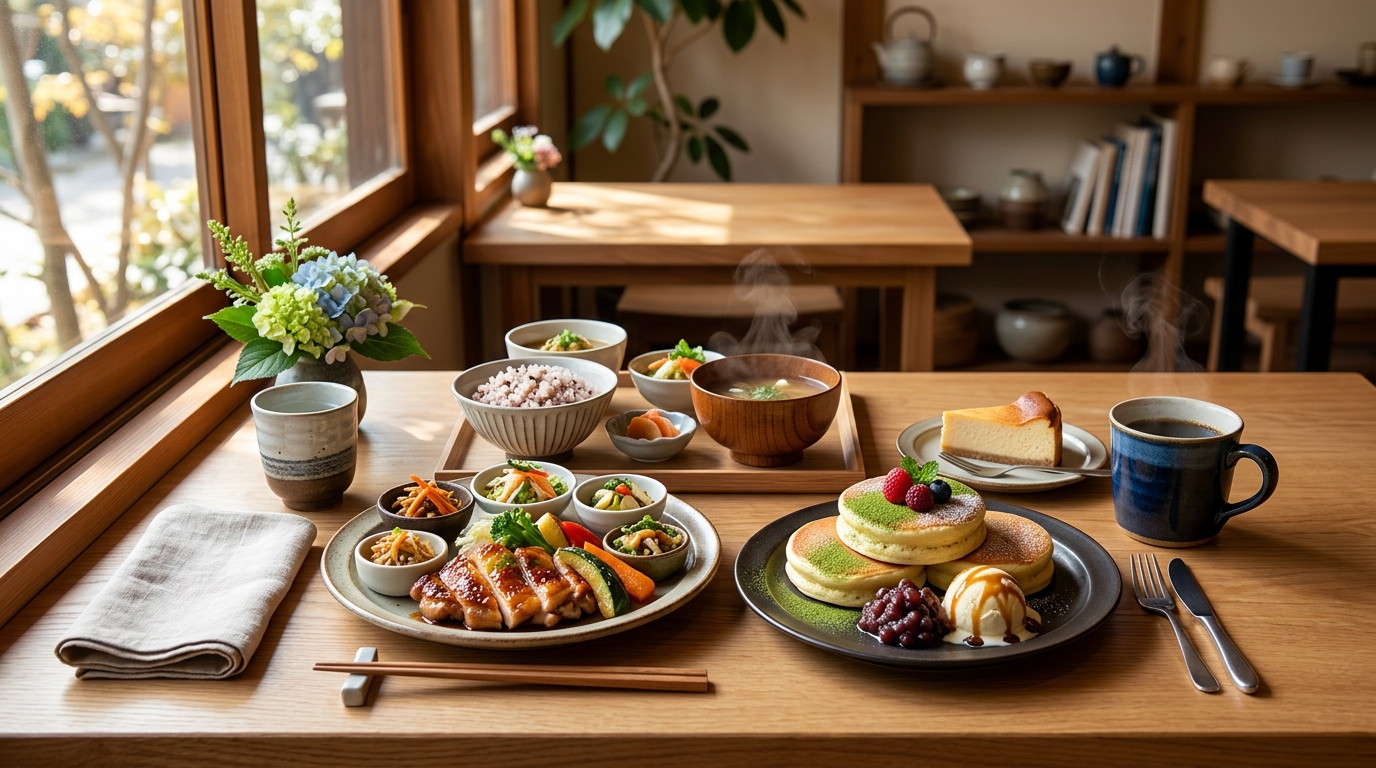 ランチだけでなく、カフェタイムも八曲音は多くの人で賑わいます。特に人気なのが、「八曲音特製 和風ふわとろパンケーキ」です。注文を受けてから丁寧に焼き上げるパンケーキは、口に入れた瞬間に溶けてしまうかのような、驚くほどのふわふわ食感が特徴。和風テイストというのが八曲音ならではのこだわりで、抹茶やきな粉を使ったソース、季節のフルーツ、そして上品な甘さの小豆が添えられています。例えば、春には桜あん、夏にはフレッシュな桃やマンゴー、秋には栗やさつまいも、冬には苺といったように、その時期ならではの素材が贅沢に使われます。特に、焼きたての温かいパンケーキと冷たいアイスクリームの組み合わせは至福の一時。コーヒーや紅茶との相性も抜群で、優雅な午後のひとときを過ごしたい方にぴったりです。価格は1,000円〜1,200円程度で、ドリンクと合わせても1500円前後で楽しめる、ご褒美スイーツとしておすすめです。